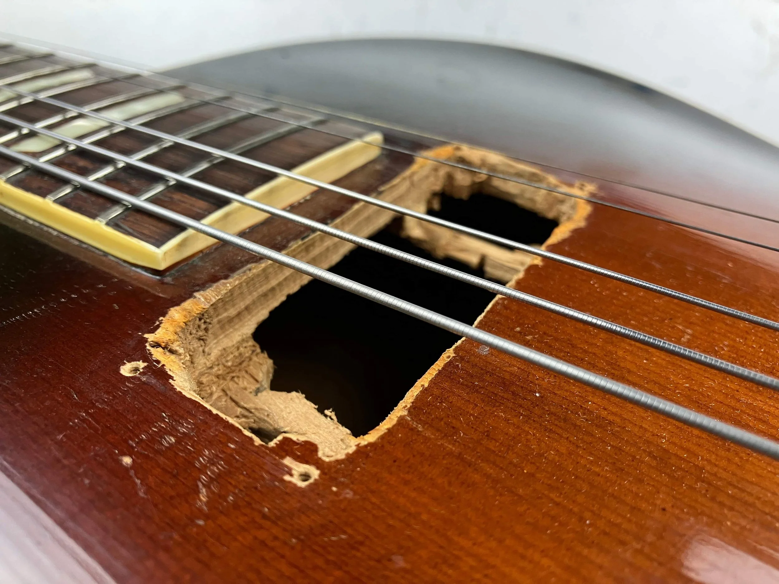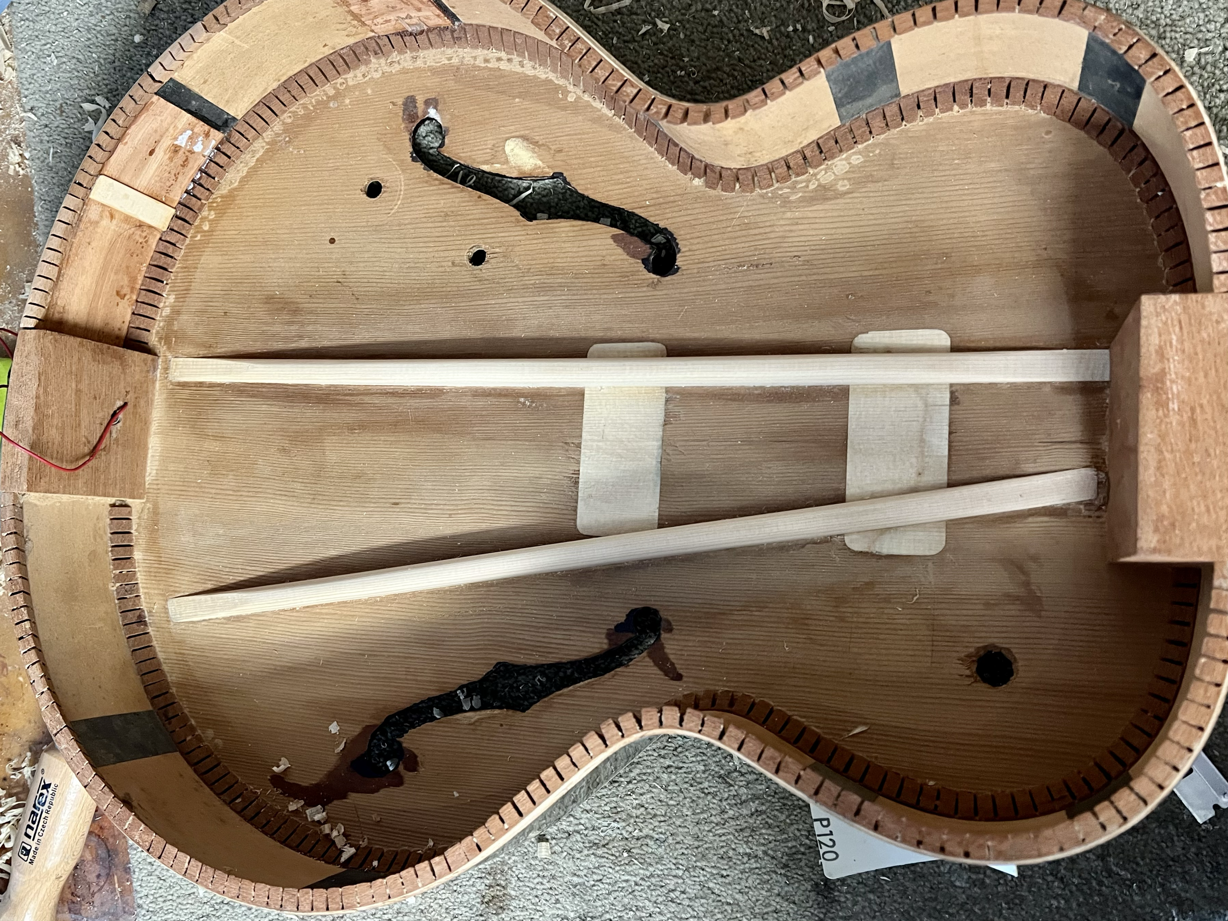 The back of the guitar was removed in order to access the damaged ladder braces.